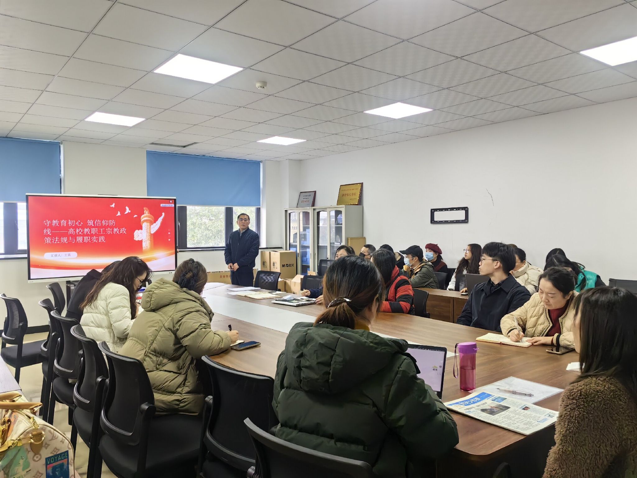 课程中,王霖围绕我国宗教政策核心要点、相关法律法规及校园履职要求展开讲解。结合高职教学场景,重点强调“教育与宗教相分离”原则,明确课堂、实训、社团管理等环节的工作底线,提醒教师防范各类宗教渗透风险。