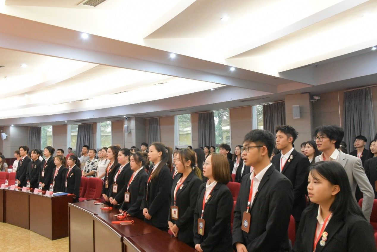 大会开始,会场的人集体起立,奏唱团歌。激昂的共青团团歌拉开了表彰大会的序幕,随后数管学院党总支副书记何酉宁宣读2021级团总支学生会干部颁发聘书及表彰决定,各位嘉宾老师分别为2021级全体学生会干部颁发聘书和荣誉证书。