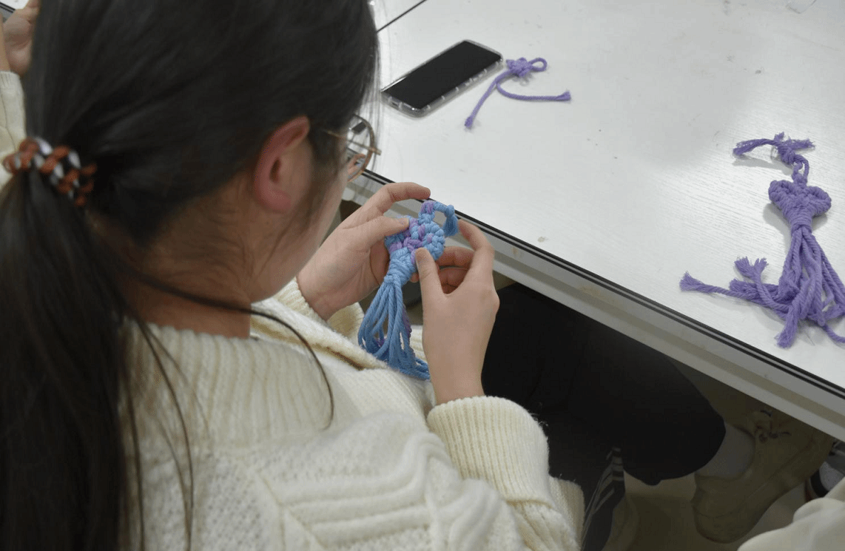 在经纬工艺协会的现场指导下,同学们通过视频教学、现场演练、修正调整、不断尝试,最终巧妙地将一根根彩线编织成各种造型,感受到了传统手工艺的魅力。