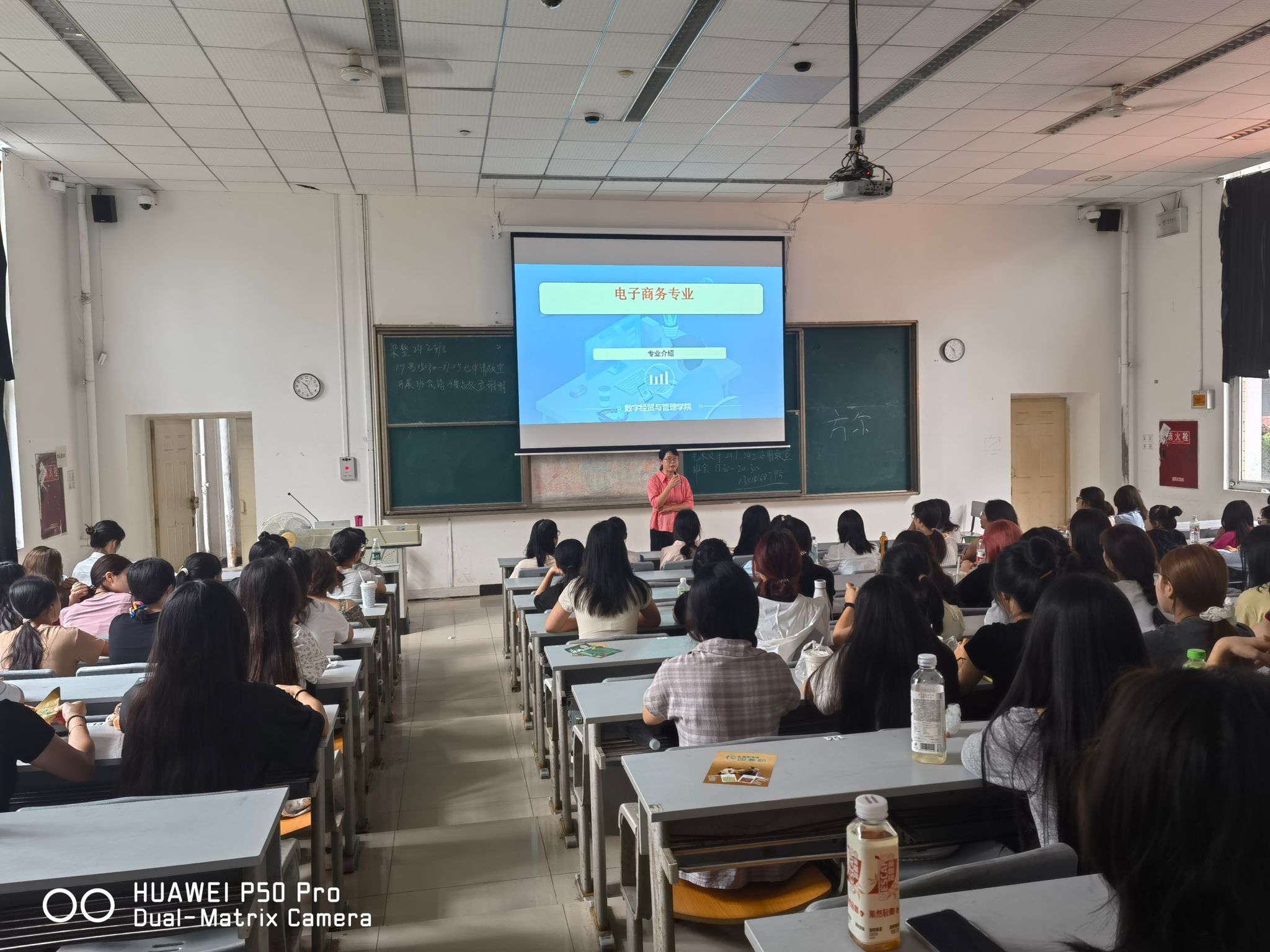 数字商贸教研室主任庞霓红老师介绍了数字商贸教研室的专业构成、电子商务专业的师资团队情况以及各班级的导学老师。电子商务专业负责人赵韦韦老师围绕电子商务培养目标、课程介绍、就业方向、竞赛成果、合作企业进行了详细介绍,最后针对2024级的人才培养方案进行了解读,为同学们的未来规划点亮了明灯,引领他们向着更加辉煌的明天迈进。