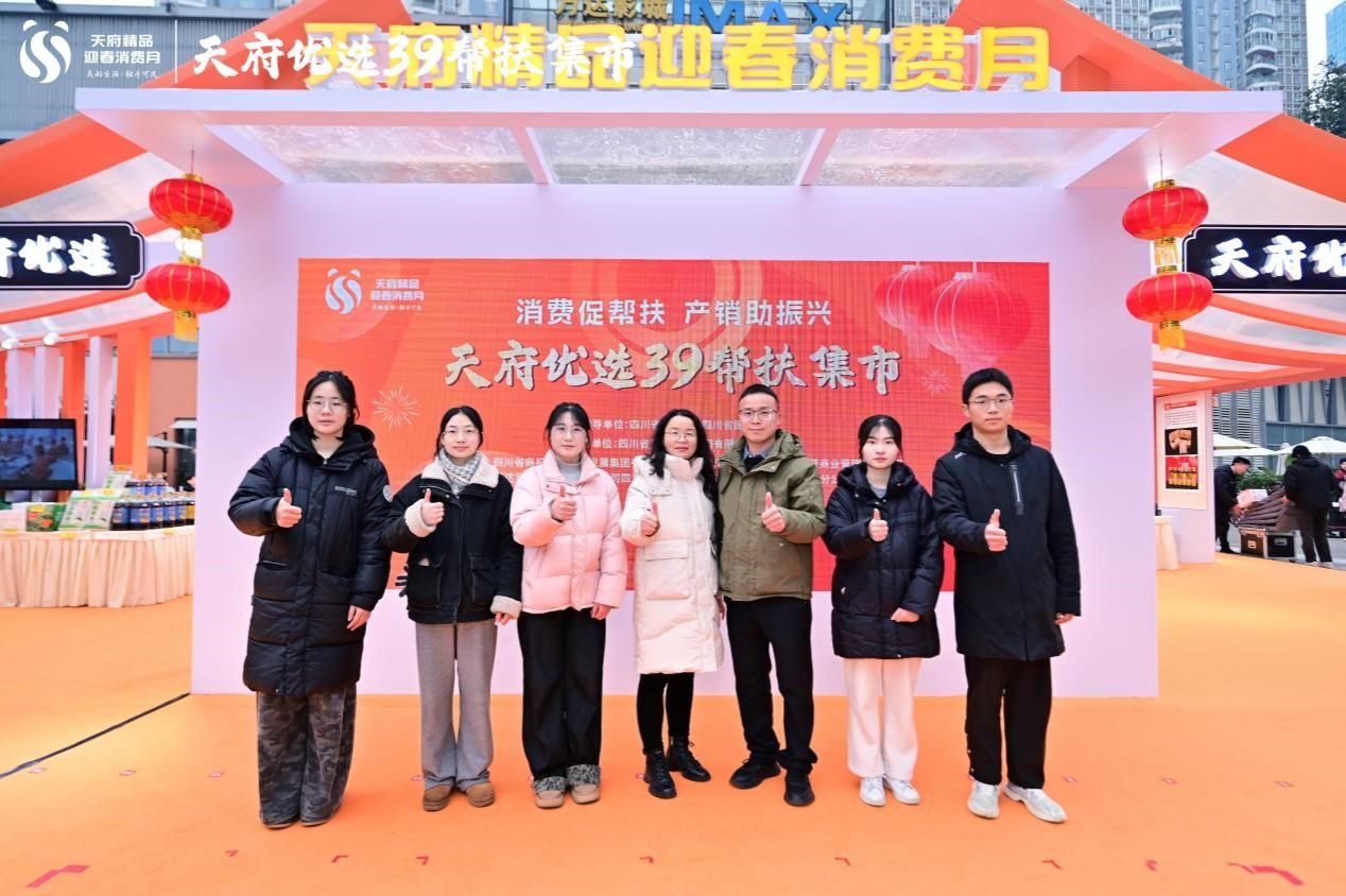 1月17日,由四川省商务厅、四川国资委指导,四川省商业投资集团主办的“天府精品”迎春消费月专项活动——“天府优选”39帮扶集市在成都市锦华万达盛大启动。数字经贸与管理学院祝红军老师带领供应链运营专业5名志愿者同学参加了活动,协助活动开展,深入开展市场调研,探寻专业发展方向。