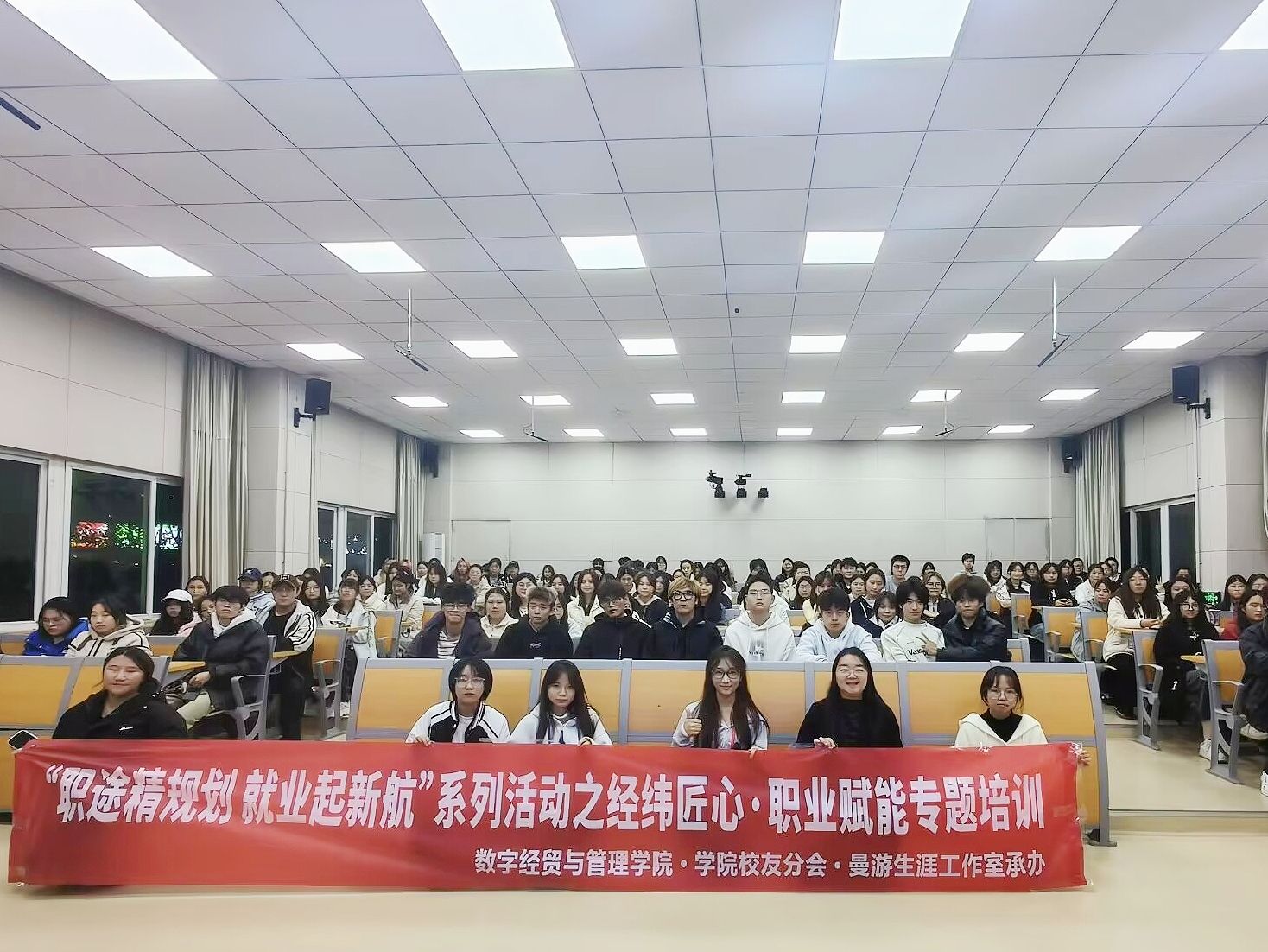 11月11日下午6:00,数字经贸与管理学院于明德楼X1114举办了“经纬匠心·职业赋能”系列第五期专题培训活动。本期培训活动以“职规赛动员与成长赛道生涯报告制作”为主题,特邀国家认证职业生涯规划师李曼老师担任主讲。