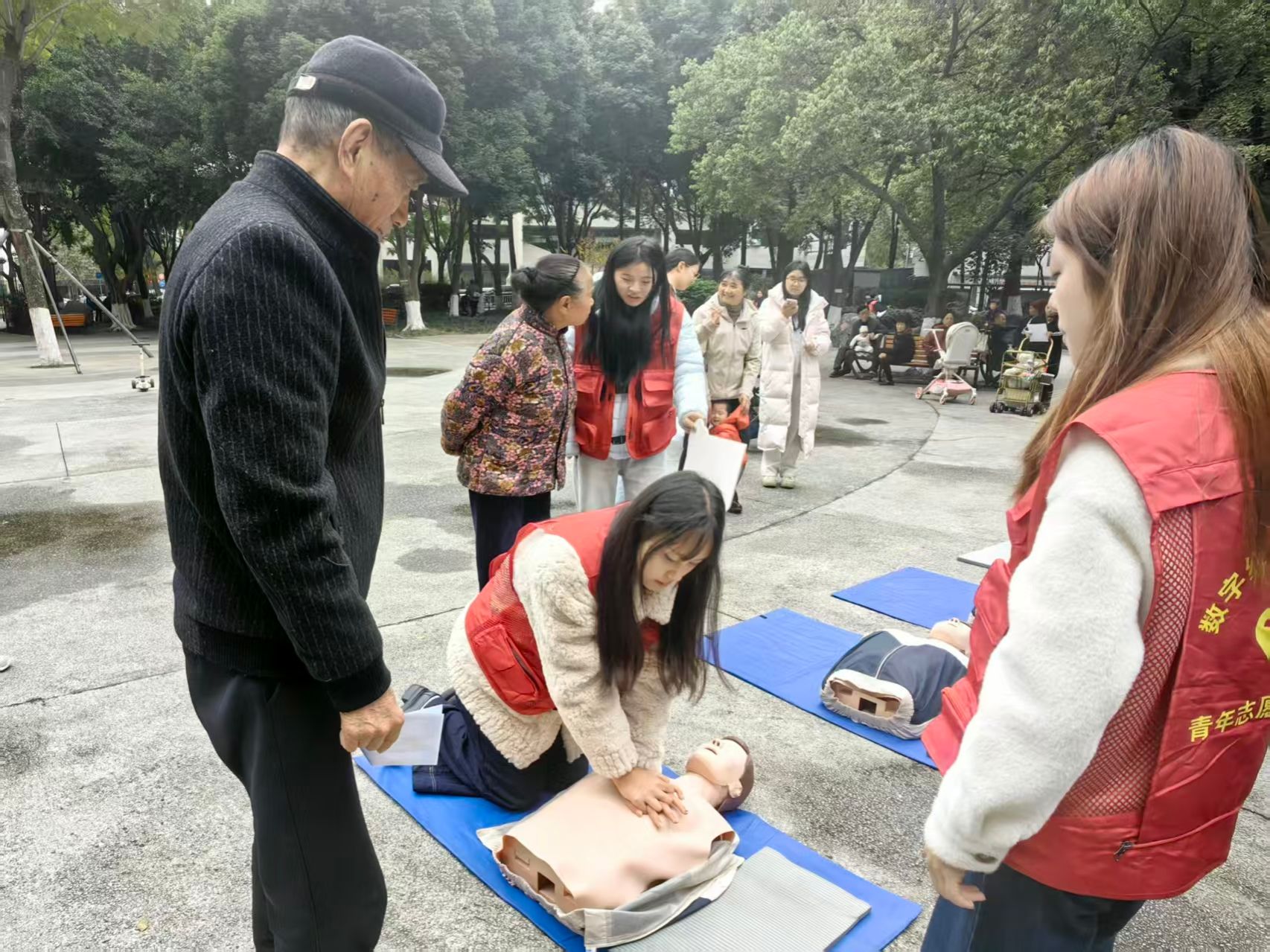 培训结束后,活动转向社区科普,志愿者们向过往市民发放急救宣传手册,用通俗语言讲解急救培训的重要性。同时,由几名同学配合完成心肺复苏真人模拟演示,直观展示操作流程。
