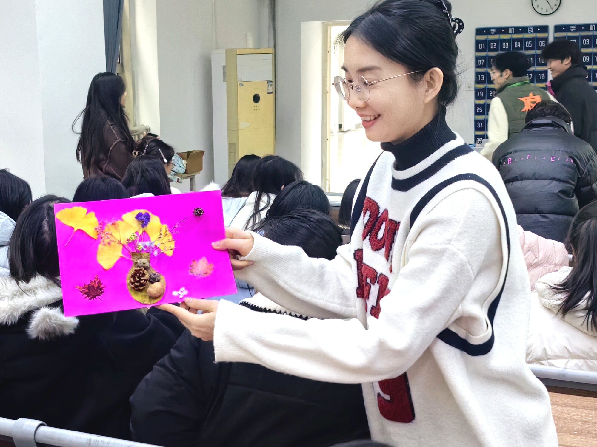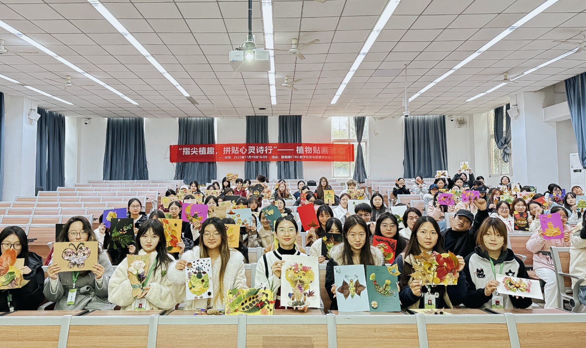 作品完成后,大家纷纷捧着自己的创意成果合影留念。镜头定格下一张张满是成就感的笑脸,快门声不仅记录了由金黄叶片、干花干果等拼成的精美作品,更留存了携手创作的欢乐与对自然之美的共同热爱。每一幅作品都承载着同学们创作时的专注与热爱,成为心理治愈的鲜活载体。这些作品的展示,不仅是创意的分享,更是心理能量的传递。通过亲手触摸、拼贴自然植物,参与者能在创作中释放压力,用植物拼贴出“未来愿景图”。