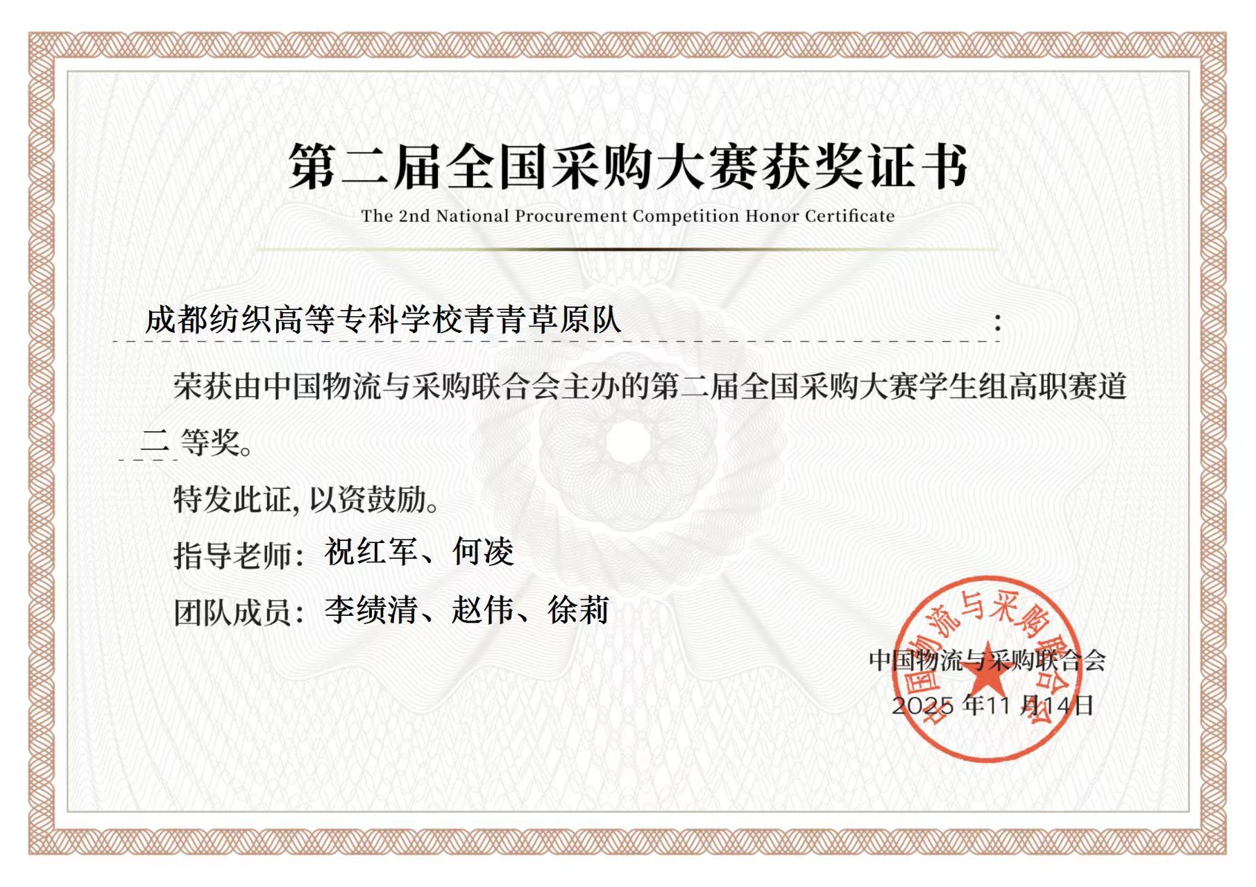 第二届全国采购大赛学生组决赛于2025年11月8日圆满落幕。经过多轮激烈角逐,我校数字经贸与管理学院两支参赛队伍均荣获高职赛道二等奖,充分展现了供应链运营专业学子的扎实专业素养与实战能力。
