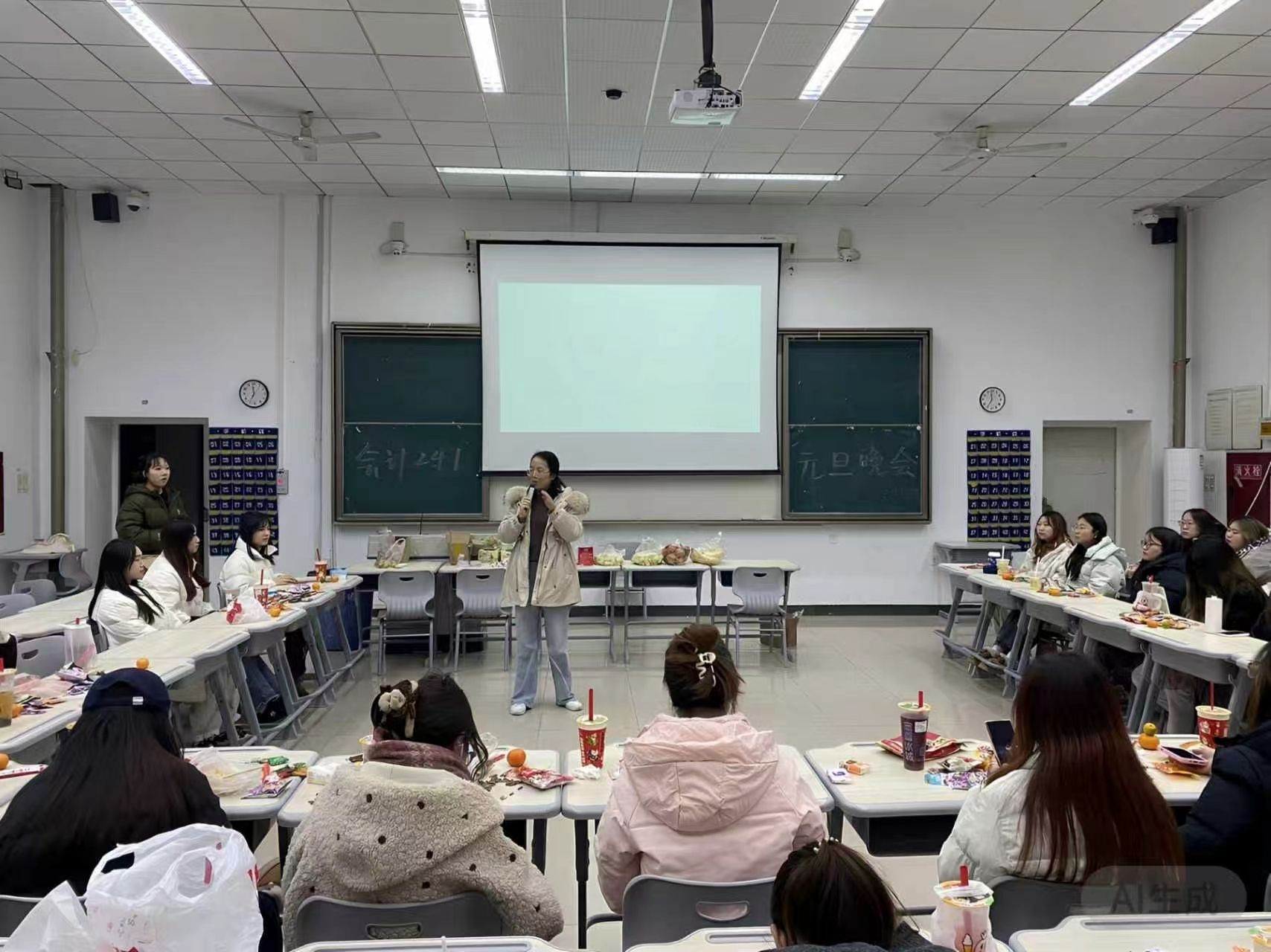 伴随着欢快的开场音乐,晚会正式拉开帷幕。晚会由文体委员主持,劳动委员带来充满童趣的《小跳蛙》,活泼明快的曲调搭配俏皮的肢体动作,瞬间把现场氛围拉到轻松欢快的顶点,同学们跟着哼唱摇摆。除了精彩的文艺节目,晚会还设置了趣味十足的游戏互动环节。“击鼓传花”让玩偶在欢声笑语中传递,中奖同学的即兴表演赢得阵阵掌声,成功表演者还收获了惊喜小奖品;“你画我猜”考验着搭档间的默契,无声的比划与机智的猜测碰撞出欢乐火花;“海龟汤”则激发了大家的推理潜能,各组激烈角逐,推理正确率高的小组满载而归。晚会中场,辅导员徐燕老师回顾了过去一年班级的成长与进步,肯定了同学们的努力与付出,并送上了新年祝福:“愿大家在新的一年里,保持热爱、奔赴山海,在学业上勇攀高峰,在生活中收获挚友,让青春在奋斗中绽放光彩。” 老师的话语真挚恳切,让同学们备受鼓舞。