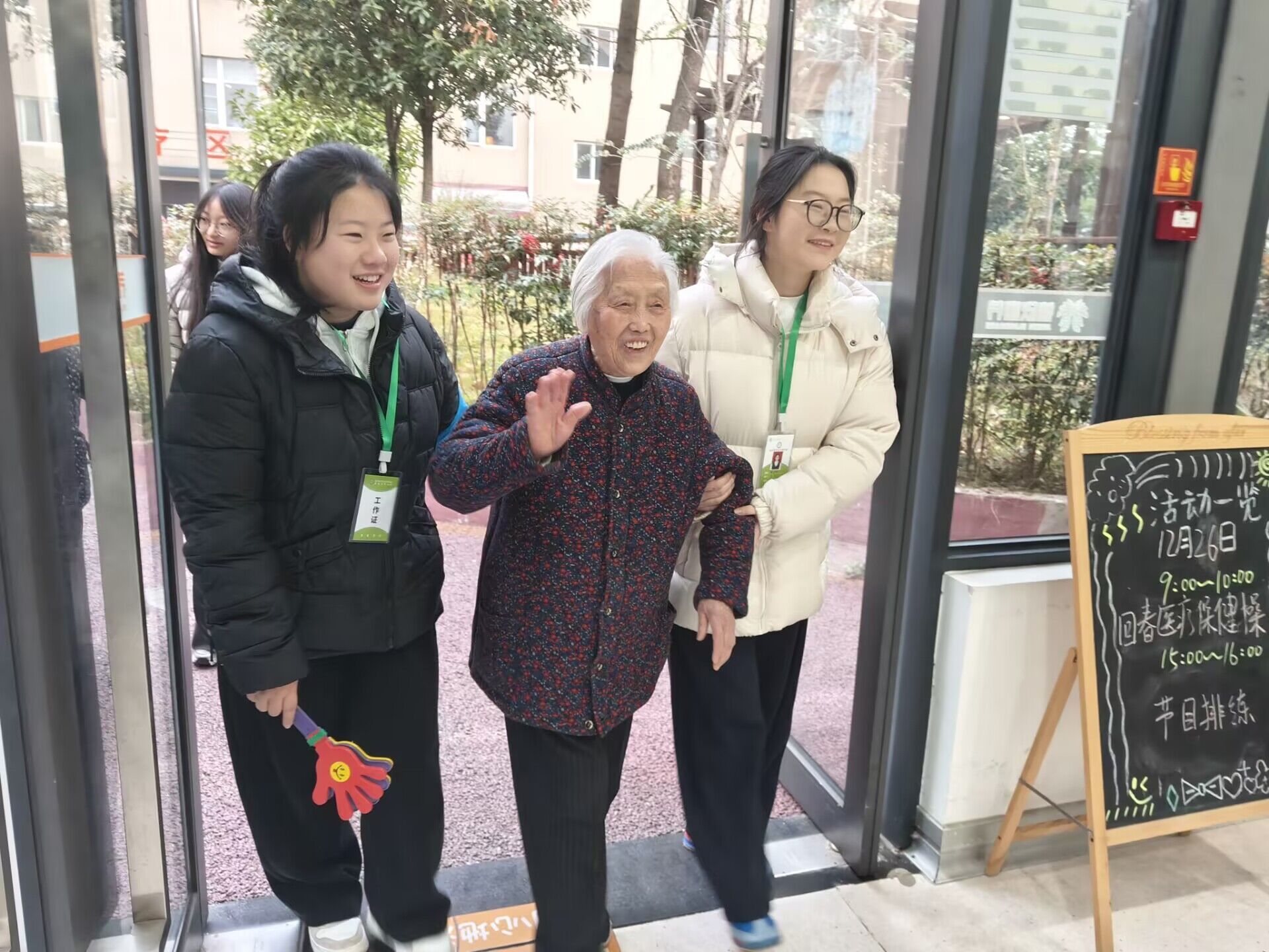 演出结束后,志愿者们走到老人身边,与他们亲切交谈、倾听心声,用实际行动传递关怀与温暖。老人们笑容满面,不时与志愿者们握手、合影,现场洋溢着温馨融洽的氛围。