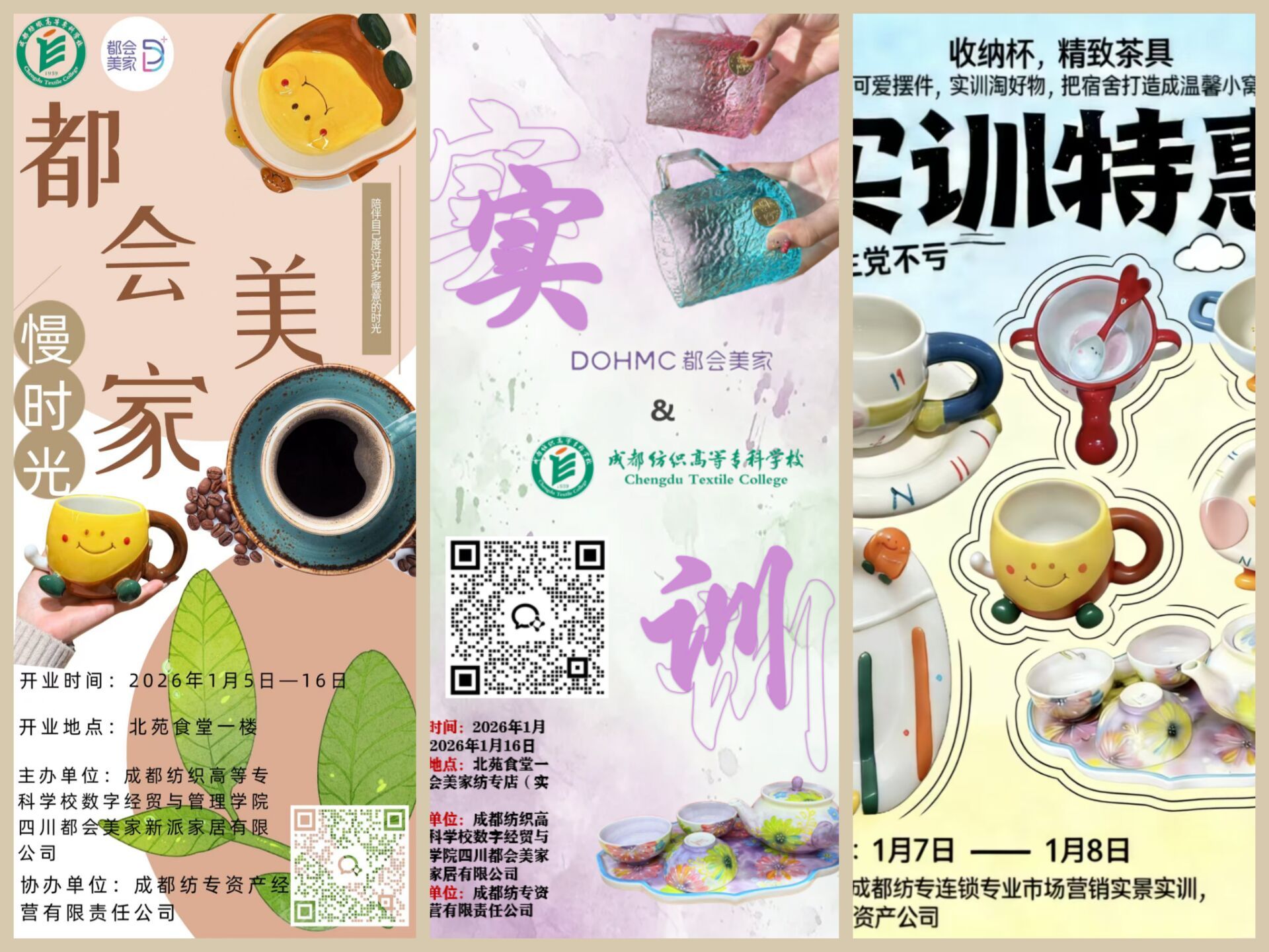 12月29日为实训首日。在专业老师的指导下,同学们精心完成了商品图册编撰,并设计出融合实训主题与产品特色的宣传海报及商品展示方案,生动呈现了“都会美家”收纳杯、精致茶具等实训商品的亮点,成为实训首日的亮眼成果。