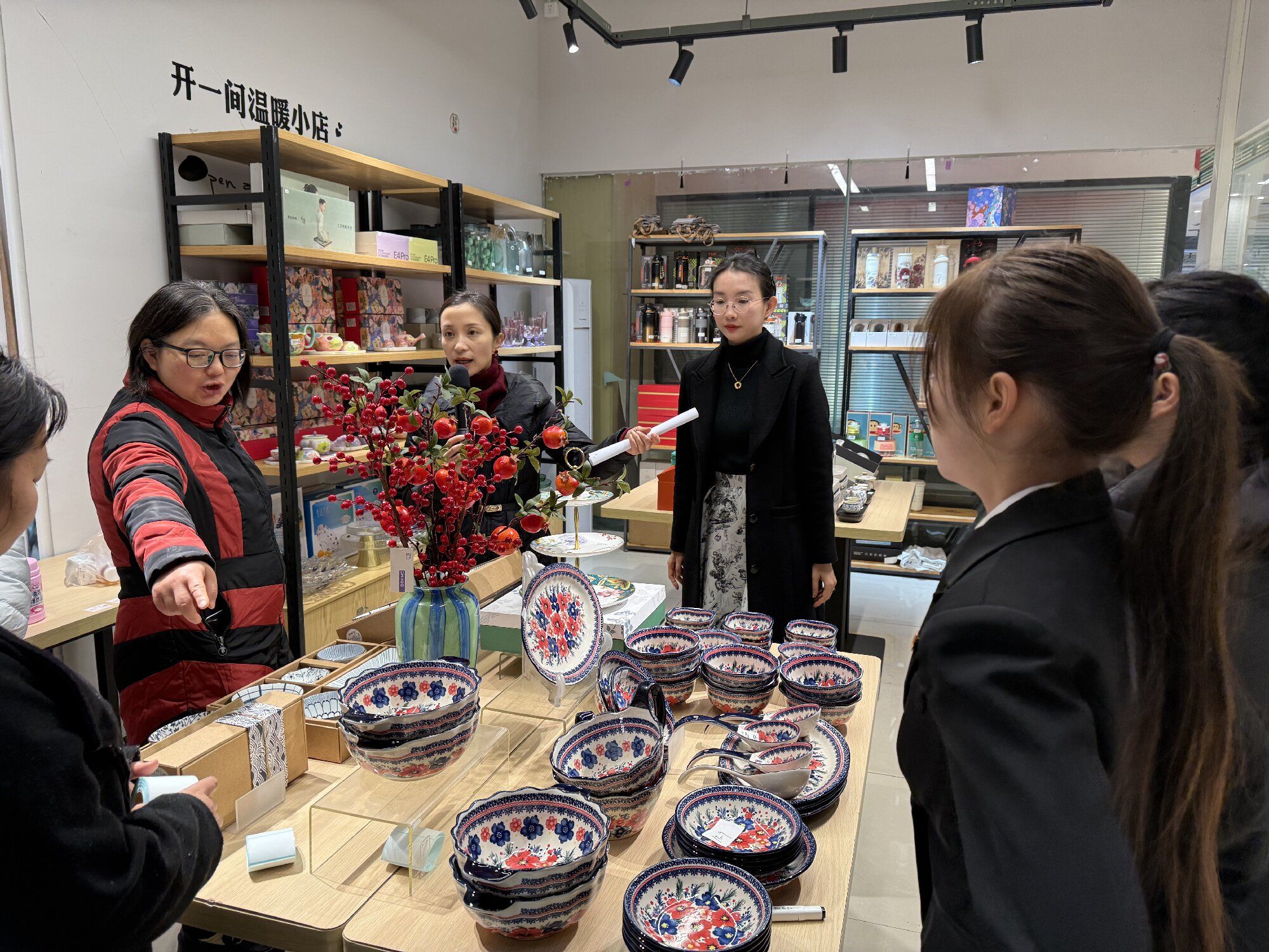 12月30日,实训聚焦实战能力培养。在专业教师陈泓越、陈雨生的全程指导及辅导员何舒婷的贴心陪伴下,同学们系统接受了销售人员礼仪规范、沟通话术技巧培训,以及卖场站点人员分配与销售全流程实操演练。现场,师生围绕餐具、茶具等核心商品展开针对性实操教学与模拟销售,同学们认真钻研、积极互动,成功将课堂理论知识转化为实操技能,实训现场氛围热烈而充实。