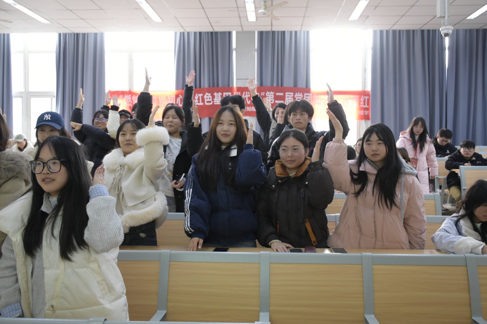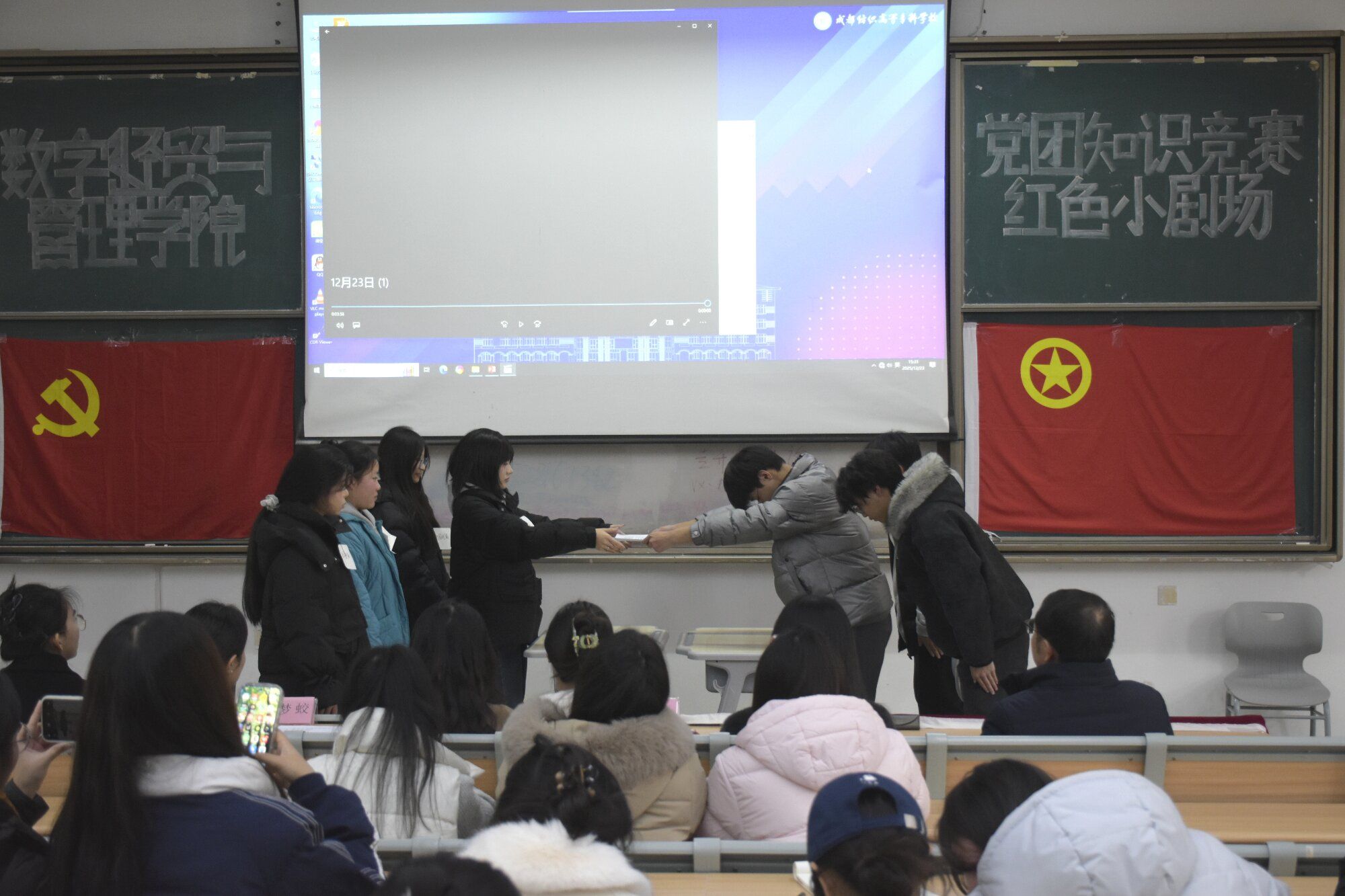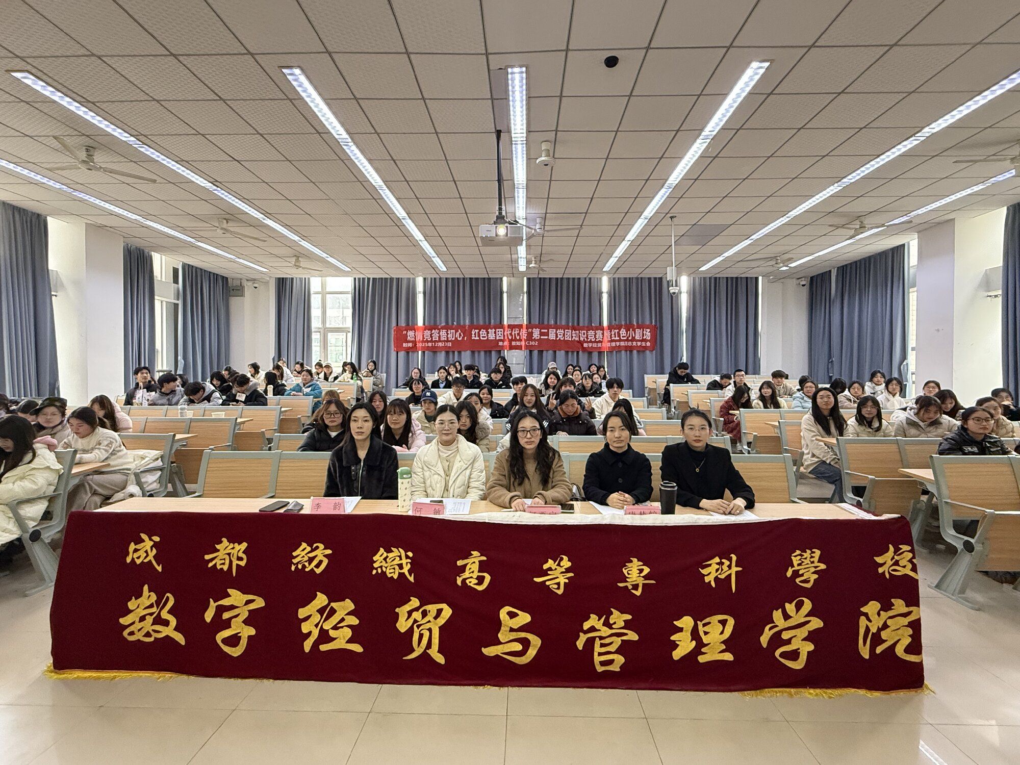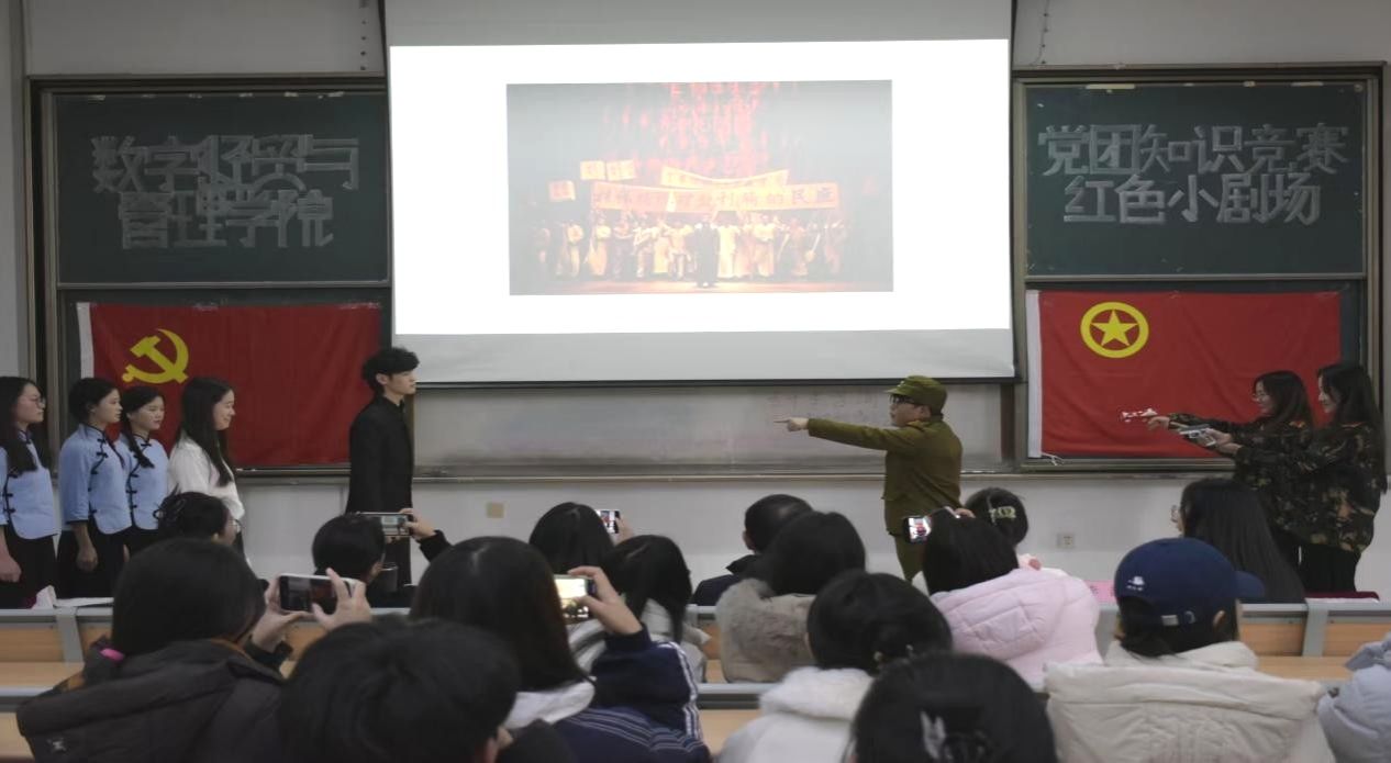 12月23日,数字经贸与管理学院团总支学生会青苗宣讲团在致知楼 C302 阶梯教室成功举办“燃情竞答悟初心,红色基因代代传”第二届党团知识竞赛暨红色小剧场活动。学院党总支书记王霖、党总支副书记兼团总支书记何酉宁、学生第二党支部书记何敏、团总支学生会指导老师李韵及辅导员唐梦蛟、何舒婷受邀出席,大一大二参赛选手、现场观众与青苗宣讲团全体干部干事齐聚一堂,在理论比拼与情景演绎中传承红色基因、筑牢理想信念。