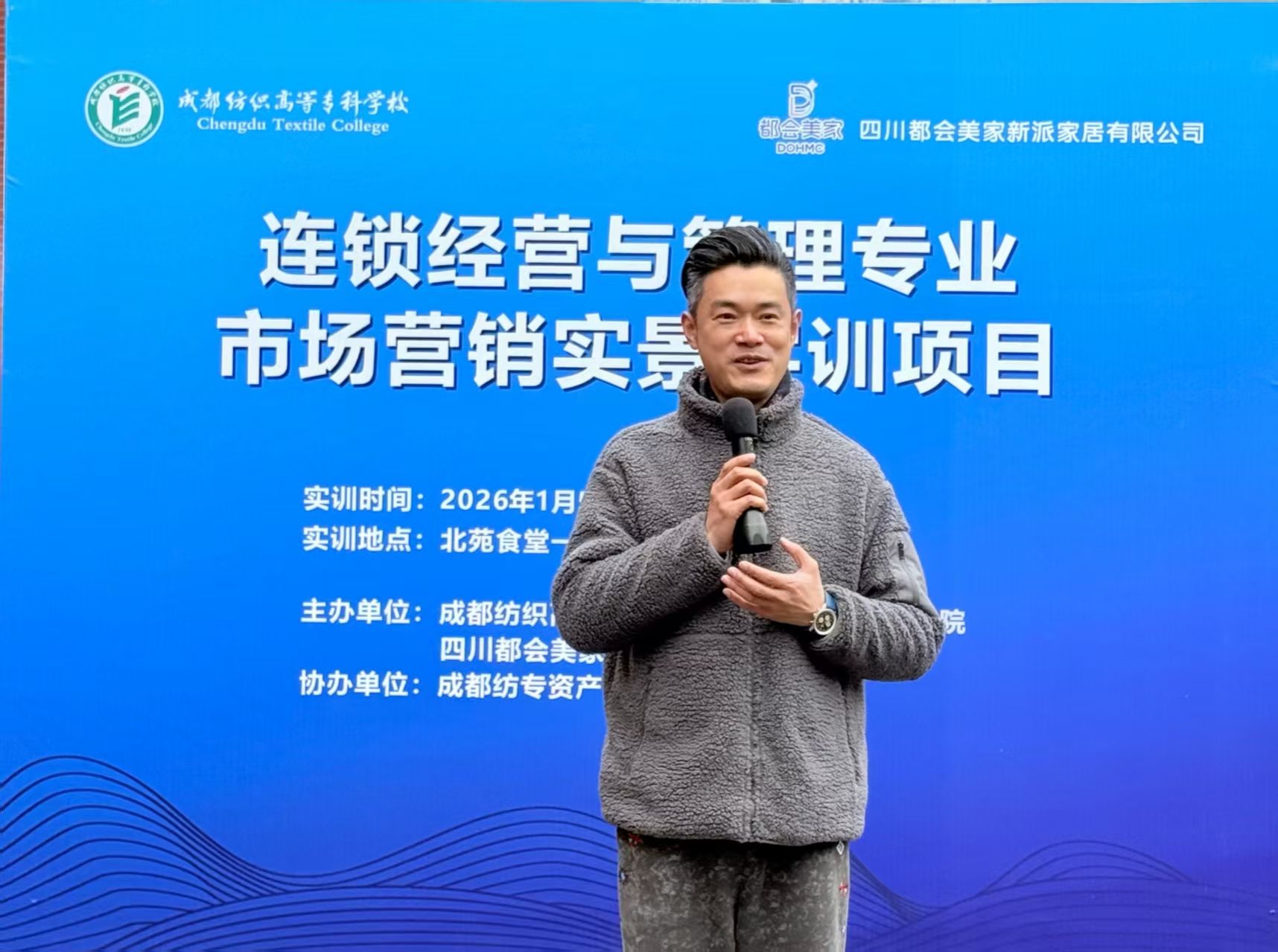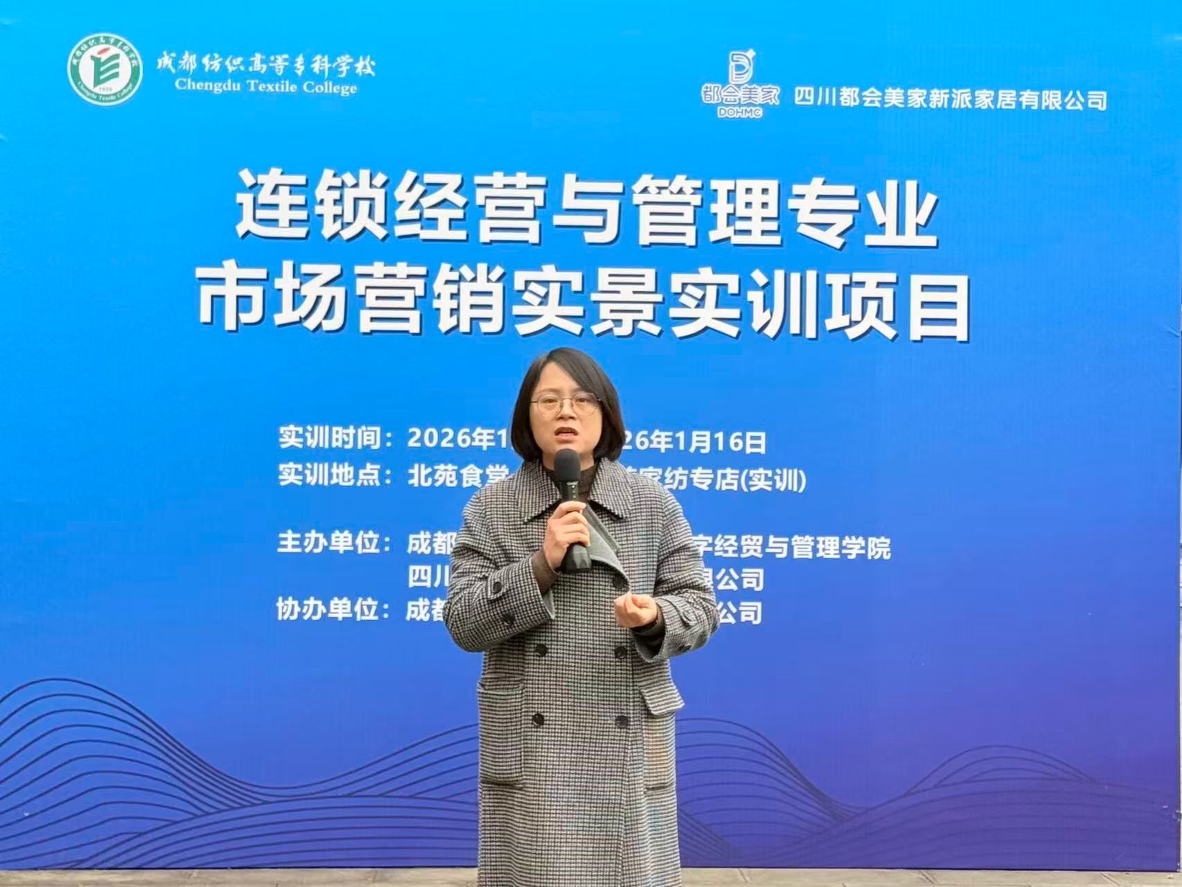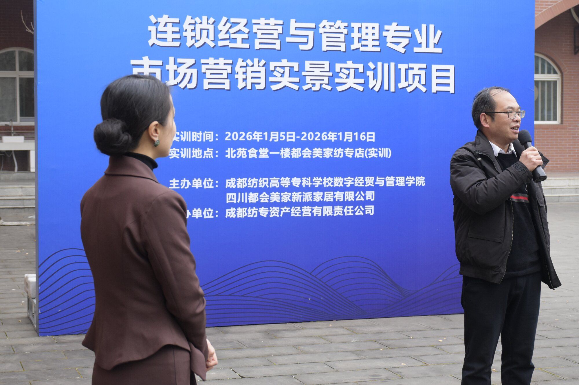 为深化产教融合,推动实践教学落地,1月5日上午9:30,“实训赋能・实战启航”都会美家纺专实训店开业仪式在北苑餐厅隆重举行。四川都会美家新派家居有限公司董事长助理赖常富先生,学校资产经营公司党支部书记申昕,学院党总支书记王霖、副院长(主持工作)何凌、副院长凌书娟,连锁专业负责人陈泓樾及全体教师,连锁2024级实训学生代表共同出席仪式。仪式由连锁专业教师陈雨生主持。