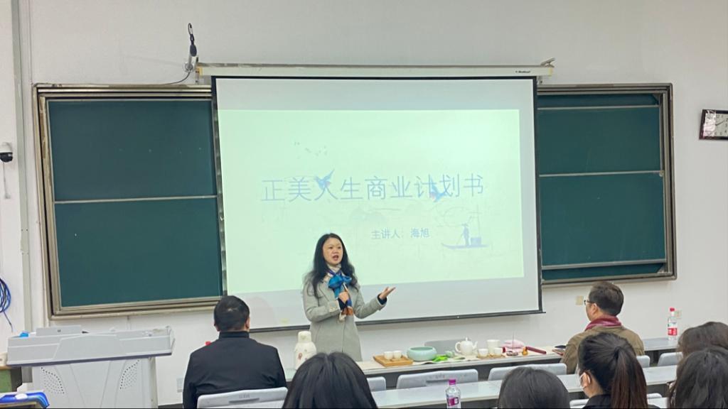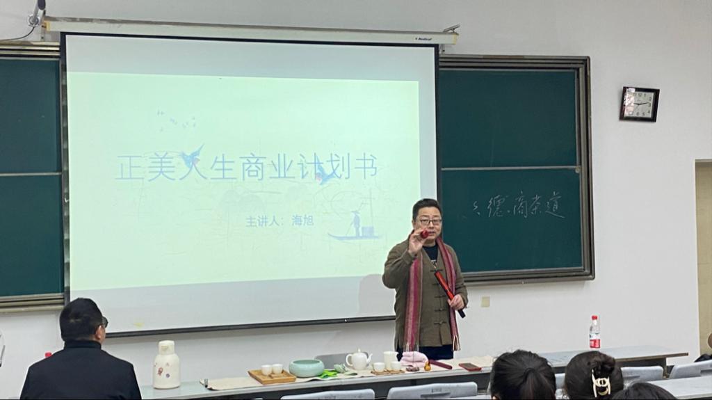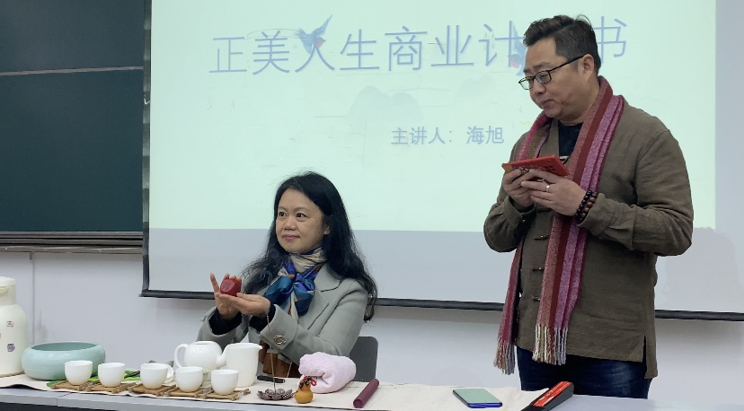 以此为引入,赵海旭老师以“人生如一泡茶”为例,怎么样用商务系统规划好人生,从传统企业到现代企业再到社会责任型企业,对人才的需求是怎么样的变化等一一进行讲解。海旭老师介绍道:本次行的《茶礼》为“六德商茶道”,茶席上每一个道具都象征着“静 智 勇 仁 强 礼 ”六德,此为同学们即将踏入社会需要秉承的品格。席上香器不是熏香的器具,而是代表我们心灵的显影剂,香直即心直,需要同学们以香为器,让心静下来;茶为守正茶:即同学们要规划如何过好“正、美”的人生,懂得需要泡好“与自己,与家人,与伙伴,与客户”的人生四泡茶,这是同学们在社会上立足的为人之道。商茶在心,提醒着同学们时时刻刻做好人生路演的准备。