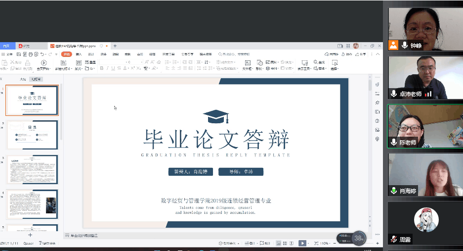 答辩前,指导教师针对每位毕业学生撰写的毕业论文,都进行了严格把关。答辩期间,参加答辩的同学利用PPT课件,线上或线下的方式,阐述各自的选题目的、理论框架、研究方法及实际意义等内容;答辩小组教师再对学生论文答辩情况进行提问,并提出修改意见。答辩现场井然有序、流程规范、组织有序,参加答辩的学生精神饱满、应答自如,整体气氛融洽,师生之间互动性强。