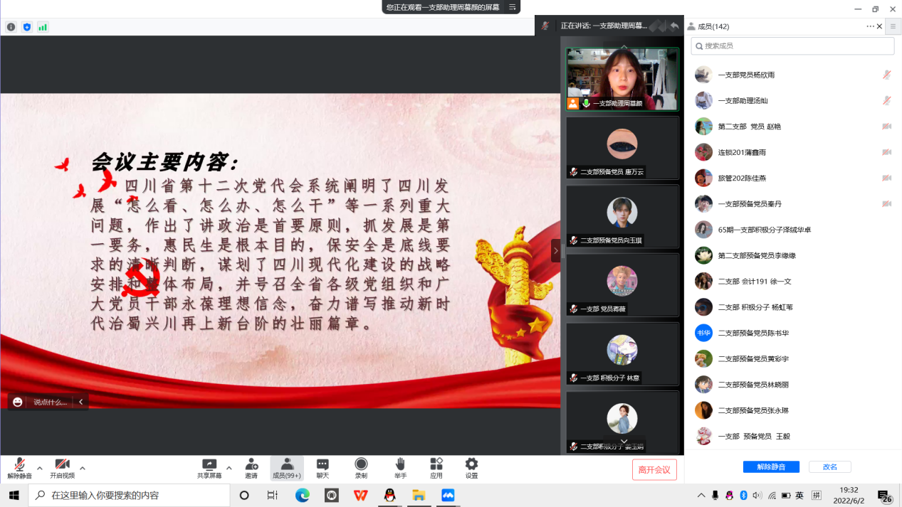 6月2日,数管学院学生党支部组织学院全体学生党员、入党积极分子,线上召开四川省第十二次党代会精神专题学习会,围绕党代会相关内容开展学习和交流。学生支部书记胡春、何敏出席会议,会议由学生党支部助理周慕颜主持。