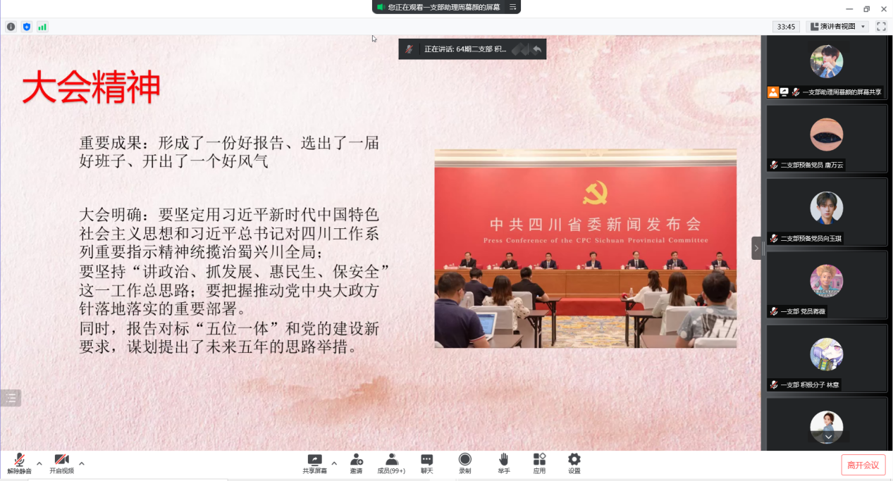 学生党支部书记胡春带领大家学习中共四川省委书记王晓晖同志代表省第十一届委员会向大会做的《高举习近平新时代中国特色社会主义思想伟大旗帜团结奋进全面建设社会主义现代化四川新征程》工作报告,传达学习会议精神。