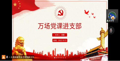 10月15日17:30数字经贸与管理学院学生党支部通过腾讯会议开展支部书记讲党课活动。学生二支部书记胡春以及学生第二党支部预备党员、党员发展对象参加活动,党课由学生二支部书记胡春主讲。