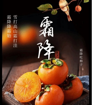 每年公历1022-24日间,清晨的露水开始凝结成霜,草木也逐渐开始枯黄。此时正是吃柿子的好时候,南方的大闸蟹出现在餐桌上,不过这两个东西千万不能同时吃哦!农民伯伯也在田里进行收土豆、拔萝卜、收白菜等农活。