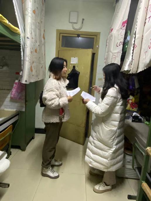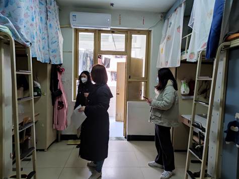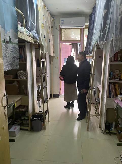 2月23日上午,数管学院党总支书记王霖、副书记何酉宁带领学院全体专职辅导员,深入走访学生寝室,对2022级108间学生寝室的6S建设情况和寝室安全状况进行检查指导。